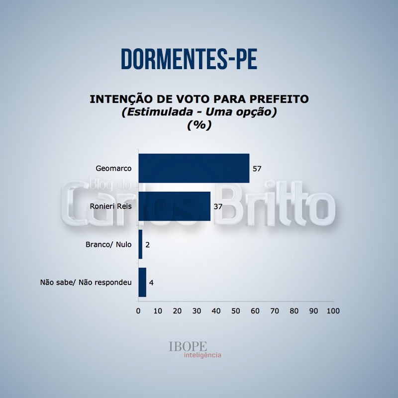 O Blog publica agora a pesquisa realizada pelo instituto Ibope no município de Dormentes, Sertão do São Francisco. O resultado mostra uma ampla vantagem, de 20 pontos, do candidato Geomarco Coelho (PSB), que disputa a eleição contra o atual prefeito Roniere Reis (PMDB).