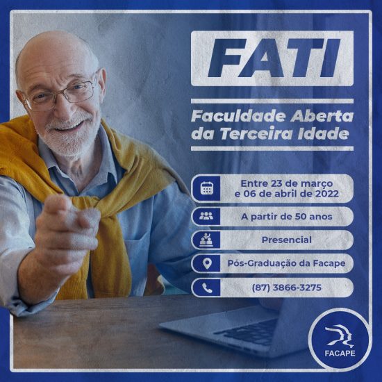 Estão abertas a partir desta quarta-feira (23), as inscrições para a Faculdade Aberta da Terceira Idade – FATI. O programa é uma parceria da Faculdade de Petrolina – FACAPE e Universidade de Pernambuco – UPE, campus Petrolina. As inscrições podem ser feitas até o dia 6 de abril, de forma presencial, no setor de Pós-graduação da Facape.