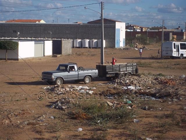 Perto das residências, um homem conduzindo uma caminhonete para numa área aberta, enquanto outro despeja os entulhos do trailer, sem nenhuma cerimônia e com um descaramento sem tamanho.