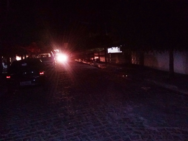 Fiquei pasmo quando cheguei ontem, por volta da 18h, na residência de uns amigos na Rua do Sorriso, no bairro Areia Branca, e me deparei com a total escuridão, como visto na foto enviada. Iluminação mesmo só dos veículos e residências.