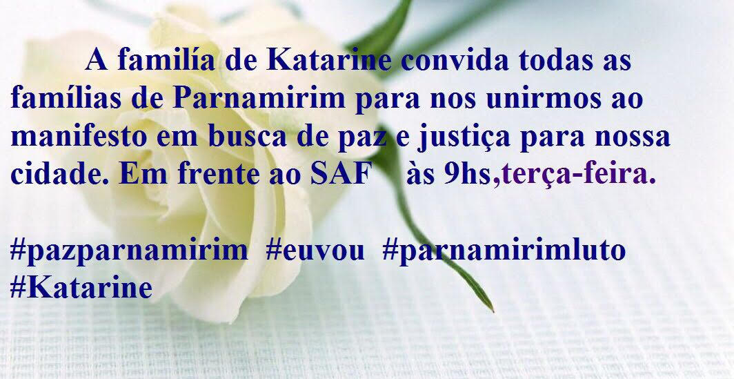 A família de Katarine Miranda, jovem de 16 anos, brutalmente assassinada no sábado, 1, pelo PM baiano, Fellype Anderson Souza Castro, convida amigos, parentes e a população de Parnamirim, sertão do Araripe, para um protesto em frente ao SAF do município, na terça-feira (4). A manifestação está programada para iniciar às 9h.