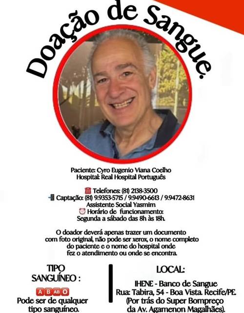 Cyro Coelho está internado no Real Hospital Português, Zona Central do Recife, mas os voluntários interessados em doar podem procurar o banco de sangue Ihene, no bairro da Boa Vista.