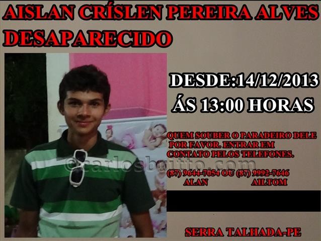 O sentimento de dor, angústia e preocupação ainda castiga o coração da família do jovem Aislan Alves, 18 anos, desaparecido no dia 14 de dezembro de 2013. Nesta terça-feira (14) faz um mês que o garoto está desaparecido. Em conversa com O Farol, o pai dele, Ailton Pereira, revelou que a família percorreu os municípios de Salgueiro, Orocó, Cabrobó, Mirandiba e Carnaubeira da Penha em busca de pistas do menino.