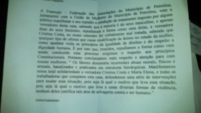IMG_20150512_210604_423Uma nota assinada pela Federação das Associações do Município de Petrolina (Feamupe) e respaldada pela União das Mulheres deu o que falar na sessão plenária de ontem (12) na Casa Plínio Amorim.