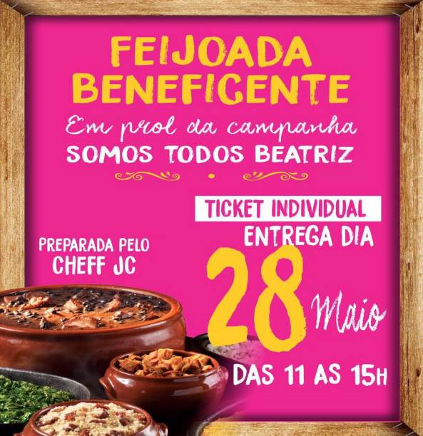 A campanha ‘Somos Todos Beatriz’ ganhará o reforço de mais um ato de solidariedade. Uma feijoada beneficente será realizada em Juazeiro (BA), no próximo dia 28 de maio. O evento servirá para angariar recursos e continuar a campanha para prender o assassino da garota, que foi morta em dezembro de 2015, no Colégio Nossa Senhora Auxiliadora, Centro de Petrolina.