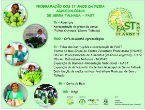 A Feira Agroecológica de Serra Talhada (Fast) ganhará uma programação especial para comemorar os seus 17 anos de fundação. O espaço serve de afirmação da agroecologia como alternativa viável para transformar a vida das famílias do semiárido. O evento está dentro das atividades da Semana do Meio Ambiente no Sertão do Pajeú, que esse ano trabalha o tema “Caatinga: Guardiã da Vida do Semiárido”.