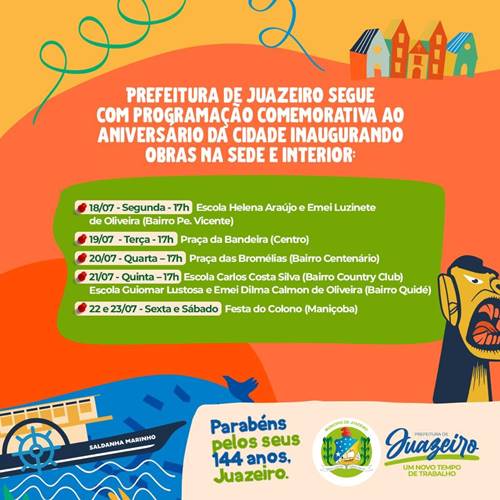 O aniversário pelos 144 anos de emancipação política de Juazeiro (BA), celebrado na última sexta-feira (15), já passou. No entanto, a prefeitura municipal prosseguirá, durante todo o mês de julho, com o cronograma de entrega de obras referente à data.