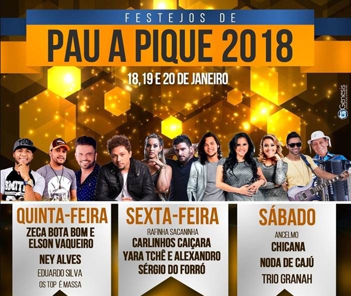 Já na sexta (19) é a vez de Sérgio do Forró, Yara Tchê e Alexandro, Carlinhos Caiçara e o músico local Carlinhos Sacaninha. No sábado (20), encerrando a programação, as atrações são Trio Granah, Noda de Caju e Chicana, além da atração local – o cantor Ancelmo.