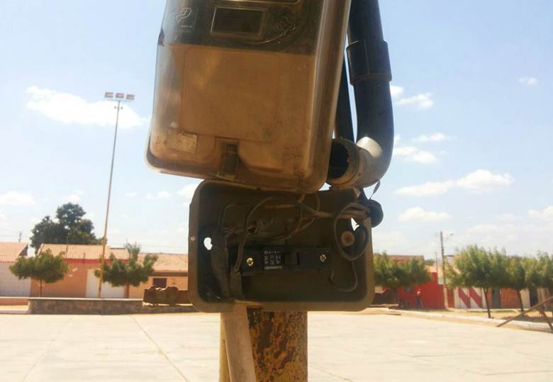 A caixa do medidor de energia da quadra está com a tampa de proteção quebrada e a fiação exposta, colocando em risco a vida das pessoas.