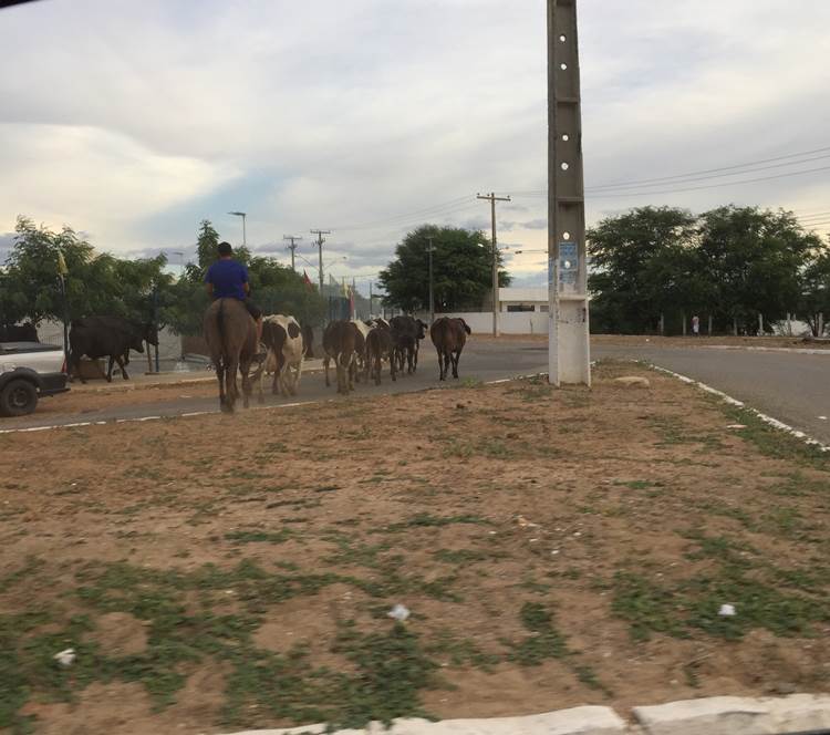 “Já flagrei diversas vezes bando de animais circulando nos bairros e ruas da cidade. Desta vez consegui registrar este homem em cima de um cavalo, conduzindo tranquilamente dezenas de animais (vacas e bois) pela rotatória do Makro, que por pouco não causa um acidente com um caminhão que transitava ali no momento. Moro no Bairro Palhinhas e, no meio da rua, sempre tem criações tanto de bovinos quanto de caprinos. Já chega né?”, desabafa.