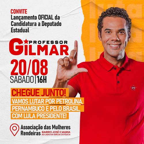 O vereador Gilmar Santos (PT) fará o lançamento oficial de sua campanha para deputado estadual neste sábado (20), a partir das 16h, na Associação das Mulheres Rendeiras, no bairro José e Maria, próximo à Igreja Católica, Zona Norte de Petrolina.