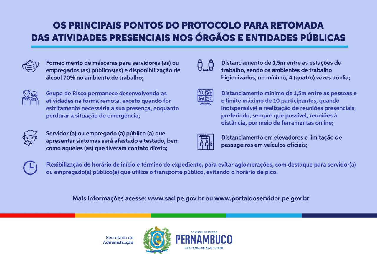 Durante todo o mês de julho, a Secretaria de Administração (SAD), com a participação das Secretarias de Saúde (SES) e a de Desenvolvimento Urbano e Habitação (SEDUH) de Pernambuco, promoveram uma ampla discussão com o Fórum de Servidores do Estado para a elaboração de um protocolo mínimo a ser adotado no retorno às atividades presenciais, baseado em medidas de preservação da vida e do bem-estar de todos os servidores, principalmente com a saúde daqueles identificados como grupo de risco.