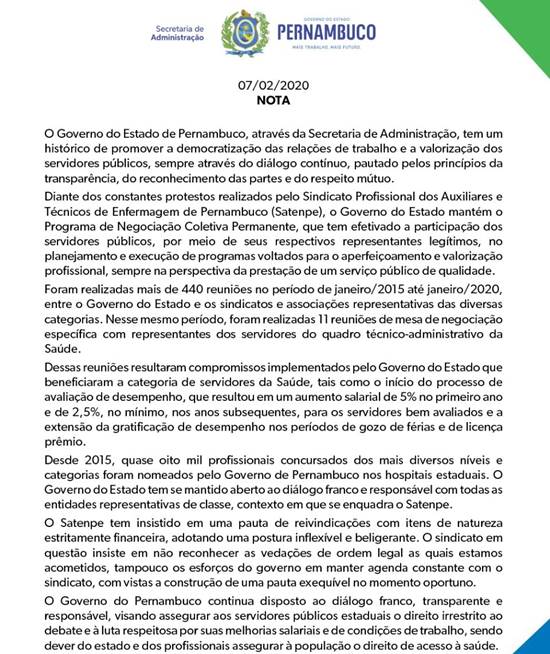 Por meio de uma nota à imprensa, o Governo de Pernambucano se posicionou acerca da greve dos auxiliares e técnicos de Enfermagem do Estado, deflagrada no final de janeiro. De acordo com a nota, o Governo Paulo Câmara ressalta que tem procurado o “diálogo contínuo” com a categoria, inclusive mantendo o Programa de Negociação Coletiva Permanente.