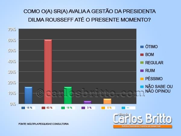 Para 60%, o Governo Dilma é considerado ‘bom’, 16% responderam ‘ótimo’ e outros 16% acham ‘regular’, enquanto 3% dos entrevistados consideram ‘ruim’ e 5% ‘péssimo. O percentual dos que não sabem ou não opinaram foi praticamente nulo.