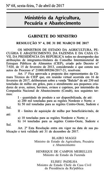 O DOU de hoje também publica a Resolução 4/2017, assinada pela Casa Civil da Presidência da República e os ministérios da Agricultura e da Fazenda. O documento aprova, oficialmente, proposta feita por representantes do Conselho Interministerial de Estoques Públicos de Alimentos (CIEP), que, no último mês de fevereiro, deliberaram sobre a concessão das 200 mil toneladas de milho para o Nordeste, nos termos da Portaria 780/2017, e de 50 mil toneladas do grão para as regiões Centro-Oeste, Sudeste e Sul. As informações são da assessoria do senador. (foto/reprodução)