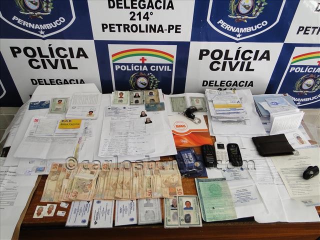 Com o grupo foram apreendidos sete carteiras de identidade (RGs), sete CPFs falsificados, aproximadamente R$ 3 mil em dinheiro, cartões de crédito e cartões de benefícios sociais, contratos de empréstimos bancários em nome de diferentes pessoas, um veículo Fiat Strada, chips para celular, diversas fotos 3×4 e ao menos 50 comprovantes de residências em nomes de vários donos. O levantamento feito pelos policiais aponta que pelo menos onze cidades em três estados eram as preferências do grupo, entre elas Garanhuns, Águas Belas e Petrolina (em Pernambuco), Paulo Afonso e Juazeiro (na Bahia) e Arapiraca (em Alagoas).