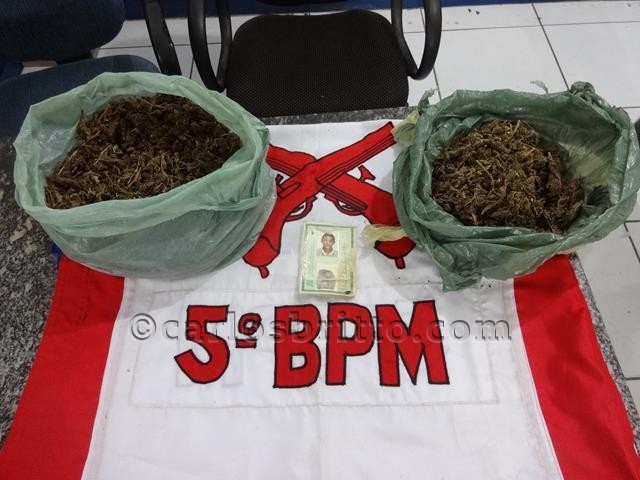 Na residência dele, localizada na Vila Nova do N-7 do perímetro irrigado Senador Nilo Coelho, a equipe do 5º BPM encontrou 920 gramas de maconha pronta para o consumo, dentro de um saco de esterco. A erva estava guardada em duas sacolas.