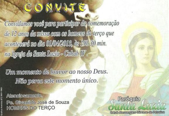 Os Homens do Terço da Paróquia Santa Luzia, no bairro Cohab Massangano, estão preparando uma grande festa para comemorar os 12 anos de fundação na comunidade. A missa, que pretende envolver não só os homens, mas as famílias de toda a Paróquia, será realizada no dia 1° de abril, às 19h30, na Igreja Matriz da Cohab.
