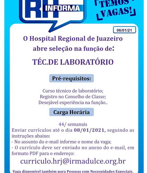 O Hospital Regional de Juazeiro (BA) abriu processo seletivo para preencher vaga de técnico de laboratório. As inscrições podem ser realizadas até sexta-feira (8), através do e-mail curriculo.hrj@irmadulce.org.br, com o anexo do currículo em formato PDF.