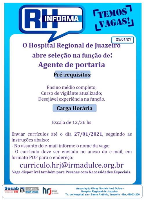 O Hospital Regional de Juazeiro (HRJ) abriu nesta segunda-feira (25) novo processo seletivo para ocupação da vaga de agente de portaria. Os interessados devem enviar o currículo anexado em formato PDF através do endereço curriculo.hrj@irmadulce.org.br, até esta quarta-feira (27). No assunto do e-mail deve ser informado o nome da vaga a ser inscrita.