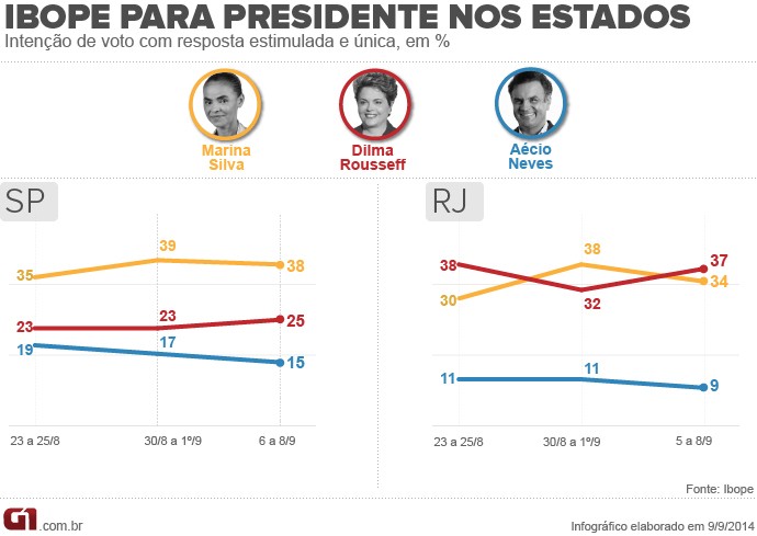 Pesquisas Ibope realizadas em São Paulo e no Rio de Janeiro mostram como está a corrida à Presidência da República nos dois estados. O nível de confiança das duas pesquisas, feitas entre os dias 5 e 8 de setembro e encomendadas pela TV Globo, é de 95%, o que quer dizer que, se levarmos em conta a margem de erro de dois pontos percentuais, a probabilidade de o resultado retratar a realidade é de 95%.