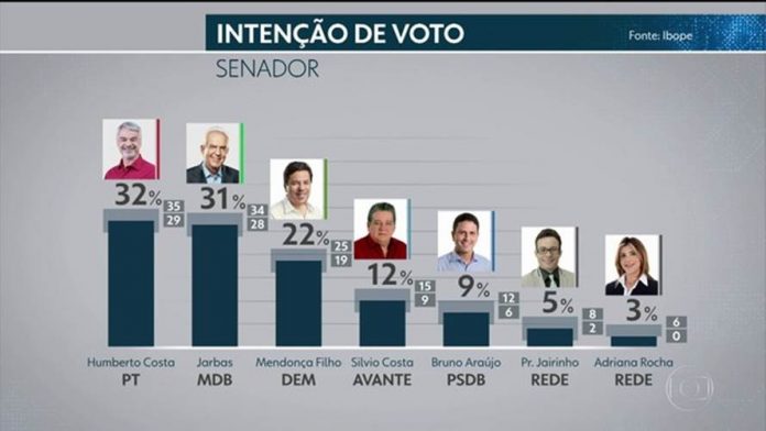 Pesquisa Ibope divulgada nesta quinta-feira (27) aponta os seguintes percentuais de intenções de voto para o Senado em Pernambuco: