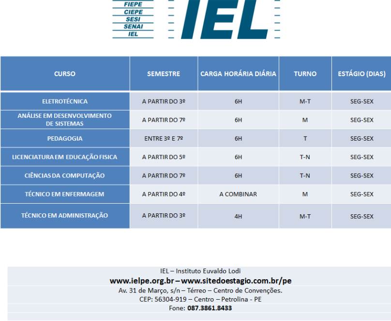 O Instituto Euvaldo Lodi em Pernambuco (IEL-PE) está oferecendo oportunidades de estágio em Petrolina. São vagas disponíveis para cursos superiores (Pedagogia, Licenciatura em Educação Física, Técnico em Enfermagem, entre outros). A lista completa pode ser conferida acessando aqui. Os candidatos devem enviar currículo para petrolina@ielpe.org.br. Quem quiser mais detalhes sobre as oportunidades pode acessar aqui ou ligar para os telefones (87) 3861-8433/9 9948-0018.