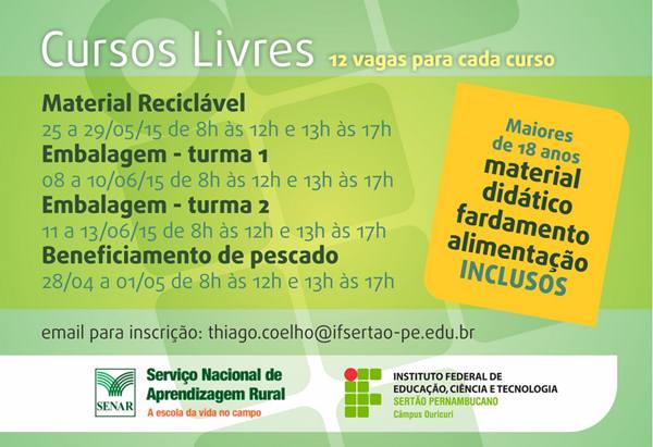 O campus Ouricuri do IF Sertão-PE e o Serviço Nacional de Aprendizagem Rural em Pernambuco (Senar-PE) vão ofertar quatro cursos gratuitos à comunidade local: Material Reciclável, Embalagem I e II e Beneficiamento de Pescado .