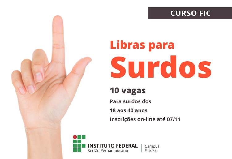 Prosseguem abertas até o próximo dia 7/11 no IF Sertão-PE/Campus Floresta as inscrições de um curso de Língua Brasileira de Sinais (Libras) voltado para surdos. Ao todo são oferecidas 10 vagas para adultos com faixa etárias entre 18 e 40 anos.