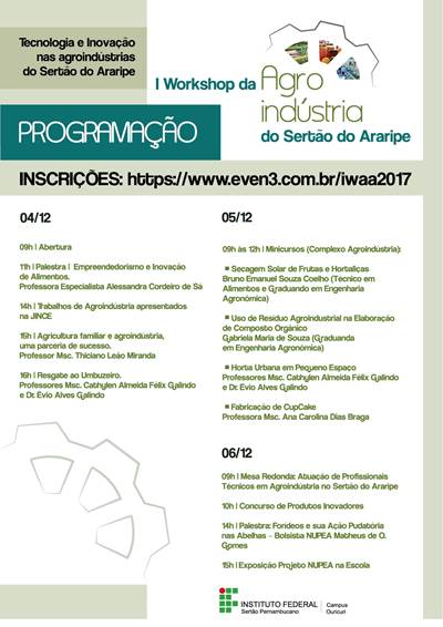 “O evento tem como importância a divulgação do curso técnico em Agroindústria e integração dos alunos e comunidade”, destacou a professora do curso de Agroindústria, Ana Carolina Braga. O workshop será aberto a todos os alunos, servidores e funcionários da instituição, além da comunidade do Araripe. Para se inscrever, o/a interessado/a deve se cadastrar pelo site do IF Sertão-PE.
