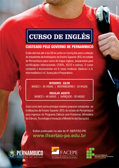 Para isso, o IF Sertão-PE está com inscrições abertas até 26 de junho no projeto “Estratégias de ensino de inglês para candidatos ao Programa Ciência sem Fronteiras do Estado de Pernambuco”, segundo informa a assessoria de comunicação.