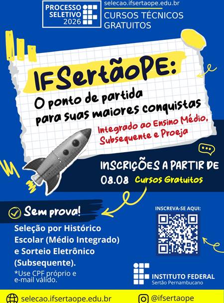 O Instituto Federal do Sertão Pernambucano (IFSertãoPE) anunciou na última segunda-feira (4) a publicação de dois editais destinados ao processo seletivo de estudantes para ingresso nos cursos técnicos da instituição com vistas ao início no ano letivo de 2026 (PS 2026). Ao todo, são oferecidas 1.736 vagas distribuídas em sete campi (Floresta, Ouricuri, Petrolina, Petrolina Zona Rural, Salgueiro, Santa Maria da Boa Vista e Serra Talhada), nas modalidades Integrado ao Ensino Médio, Proeja e Subsequente (Pós-Médio). As inscrições são gratuitas e estarão abertas no período de 8 de agosto a 14 de setembro deste ano.
