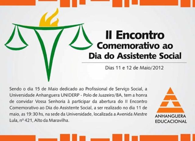 Nos dias 11 e 12 de maio, o polo Juazeiro da Universidade Anhanguera-Uniderp promoverá o II Encontro Comemorativo ao Dia do Assistente Social que é comemorado no dia (15). O evento tem como objetivo propor uma discussão sobre a educação a distância, as atribuições e competências do profissional de Serviço Social. A ação é voltada aos discentes da instituição e toda comunidade externa.