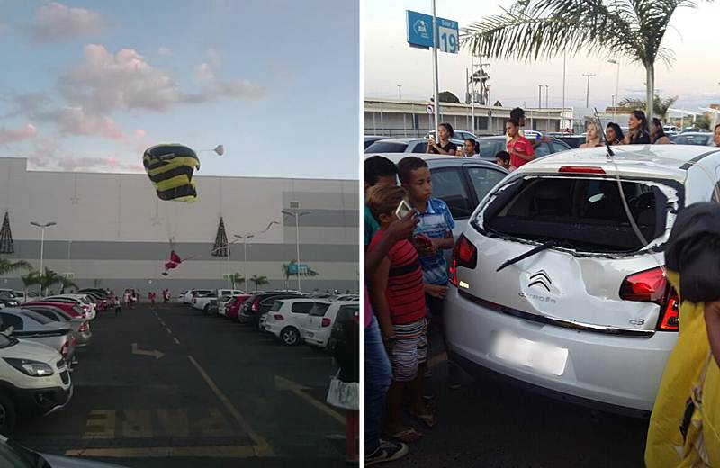 A festa promovida pelo Juá Garden Shopping, em Juazeiro (BA), no final da tarde de ontem (6), foi marcada pela presença de um grande público – e também por um incidente. O paraquedista fantasiado de Papai Noel, contratado pela direção do centro de compras para abrilhantar o evento, calculou mal a aterrissagem e acabou caindo em cima de um veículo no estacionamento do shopping.