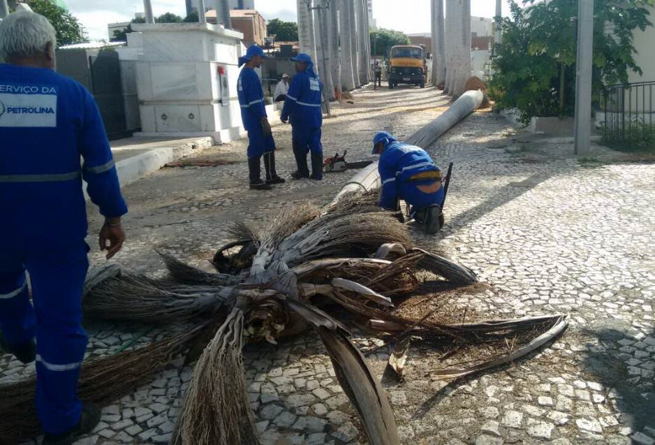 Equipes da Secretaria de Desenvolvimento Urbano e Sustentabilidade de Petrolina (SEDURBS) iniciaram os trabalhos de remoção de quatro palmeiras imperiais localizadas no Cemitério Campo das Flores, área central da cidade, que correm o risco de cair. o Serviço começou no último domingo (25), com a retirada de uma das espécies. Ao longo desta semana as outras devem ser removidas, informou a assessoria.