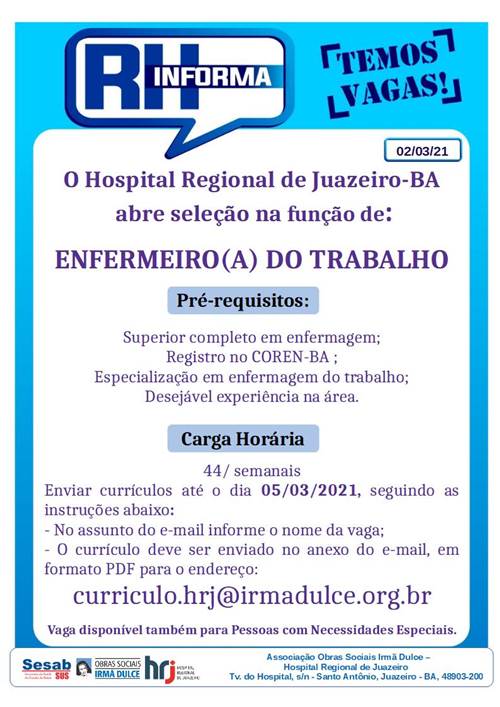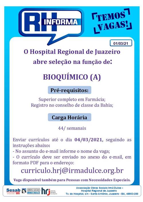 O Hospital Regional de Juazeiro (HRJ) abriu um novo processo seletivo para as vagas de bioquímico e enfermeiro do trabalho. Os interessados devem enviar o currículo anexado em formato PDF através do endereço curriculo.hrj@irmadulce.org.br até esta quinta-feira (4). No assunto do e-mail, deve ser informado o nome da vaga a ser inscrita.