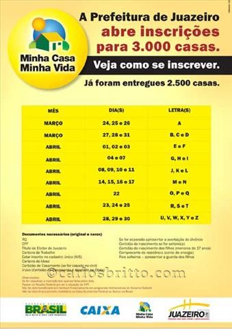 A partir de hoje, quem mora em Juazeiro poderá se inscrever no programa habitacional “Minha Casa, Minha Vida”. O atendimento será feito seguindo a ordem alfabética, obedecendo os critérios exigidos pelo Governo Federal.