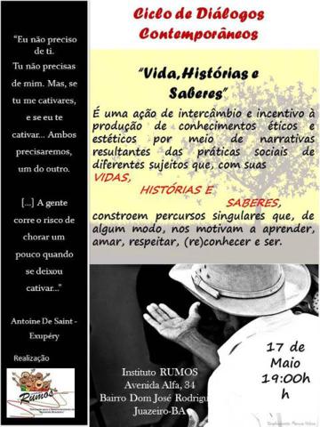 O “Ciclo de Diálogos Contemporâneos” é um Projeto do Instituto Rumos da Educação, Orgnaização não Governamental (ONG) sediada em Juazeiro, cujo objetivo máximo é a partilha de conhecimentos, histórias e saberes construídos ao longo da vida.