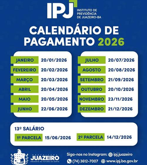 O Instituto de Previdência de Juazeiro (IPJ) divulgou o calendário oficial de pagamento dos benefícios previdenciários para o ano de 2026. O cronograma contempla aposentados e pensionistas vinculados ao Regime Próprio de Previdência Social (RPPS) do município e tem como objetivo garantir previsibilidade e organização financeira aos segurados.
