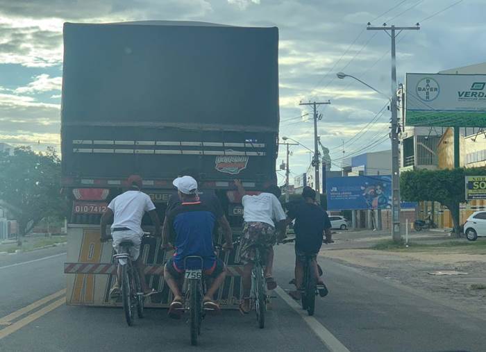 Irresponsabilidade é pouca. Flagrantes de ciclistas pegando ‘carona’ em traseira de caminhões nas rodovias de Petrolina não são de hoje, mas cinco de uma só vez passou de qualquer limite.