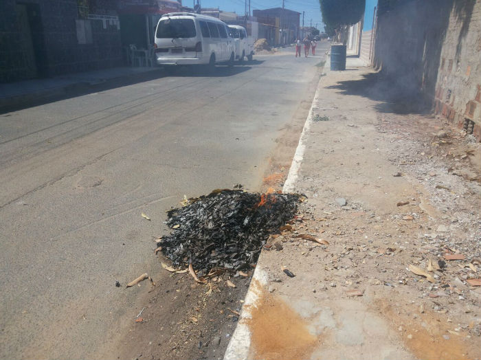 Na foto enviada por um leitor indignado, um amontado de folhas secas de árvores, papéis e outros objetos foram queimados em cima da pista. O pior é que a cena é vista rotineiramente no local – a Rua Domingos Rodrigues. Um absurdo.