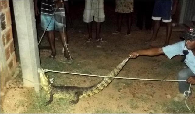 Uma das moradoras contou que ia em direção à casa da sua mãe quando foi surpreendida pelo grito do seu filho,”Olha o Jacaré” .Os populares logo se juntaram e imobilizaram o jacaré, levando o animal para o 7ª Batalhão da Polícia Militar do município, já que a cidade não possui órgão ambiental.