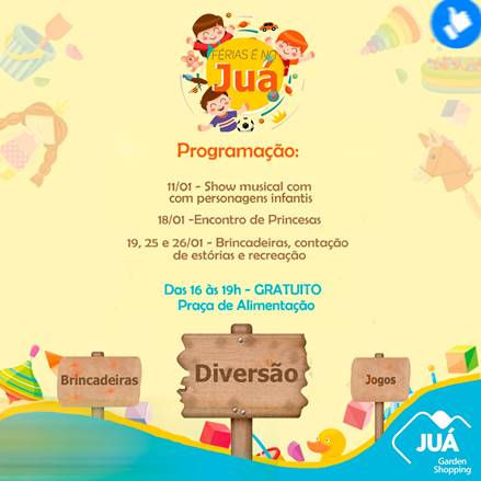 Para encerrar o mês de férias, nos dias 25 e 26, os pequenos terão a oportunidade de ouvir as estórias de João e Maria e Chapeuzinho Vermelho, com os próprios personagens. Todas as atrações começam às 16h, também na praça de alimentação. “O Juá Garden sempre busca oferecer atrações para toda família, mas neste período de férias, o foco são as crianças e este ano não seria diferente. Montamos uma programação divertida, alegre e dinâmica para que a criançada possa gastar toda energia aqui no shopping e de forma gratuita”, comentou o gestor de Marketing, Welington Junior.