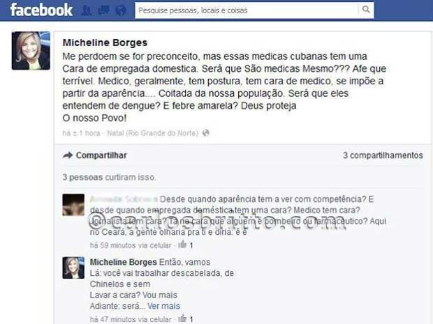 A declaração de uma jornalista do Rio Grande do Norte sobre a aparência das médicas cubanas que chegaram ao Brasil para trabalhar no Programa ‘Mais Médicos’ gerou polêmica nas redes sociais ontem (27). A jornalista Micheline Borges publicou que as médicas têm cara de “empregada doméstica” e questiona se as mulheres são mesmo profissionais da saúde. “Será que são médicas mesmo?”, contesta. Ela excluiu a conta na rede social após a repercussão da mensagem, que gerou mais de 5 mil compartilhamentos até às 16h da terça.