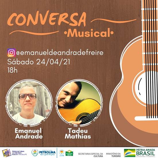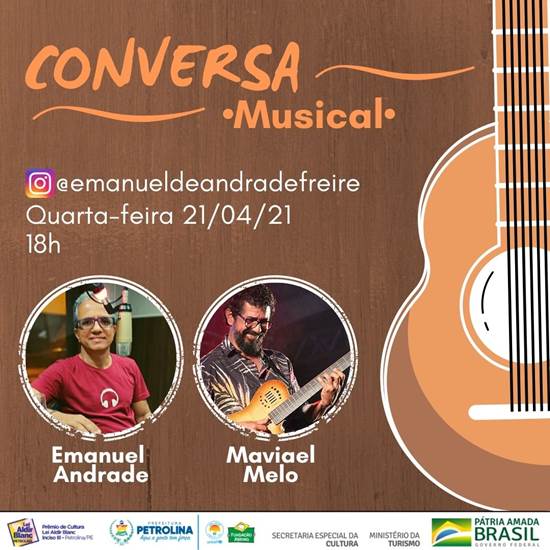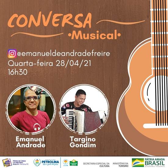 O jornalista, professor e pesquisador Emanuel Andrade, abrirá a partir desde semana uma série de entrevistas no formato de lives, por meio do projeto ‘Conversa Musical’, com artistas de vários estilos da Música Popular Brasileira. A iniciativa faz parte das atividades aprovadas, no final do ano passado, pela Lei Aldir Blanc, do Ministério da Cultura. As entrevistas serão realizadas através de sua rede social – Instagram (@emanueldeandradefreire), incialmente às quartas-feiras e sábados.