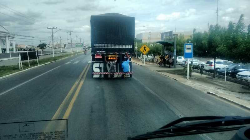 Desafiando o perigo, eles ‘pegam’ carona na traseira de caminhões que trafegam pela via, uma das mais movimentadas da cidade, colocando a própria vida em risco.