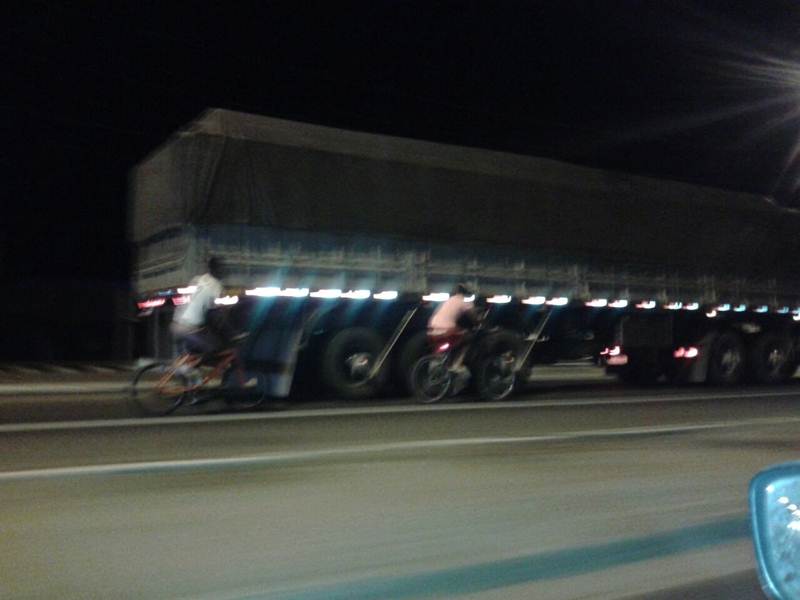 Em bicicletas, eles pegam ‘carona’ num caminhão, que devido à carga, transita em velocidade abaixo do normal na avenida. Desafiando o perigo, esses jovens podem se desequilibrar a qualquer momento e ser atropelados. O flagrante foi feito por um leitor. Fica o alerta. (Foto de celular)