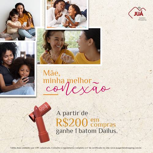 A campanha ‘Mãe, minha melhor conexão’ vai contar com uma programação especial, incluindo ainda espaço instagramável, apresentações culturais e eventos para toda família. E na compra da lembrancinha ou presentão, no Juá a mamãe ganha na hora um super mimo: um batom da marca Dailus. Para participar, o cliente precisa fazer compras a partir de R$ 200 nas lojas e quiosques do shopping, cadastrar a nota fiscal e pegar seu presente.