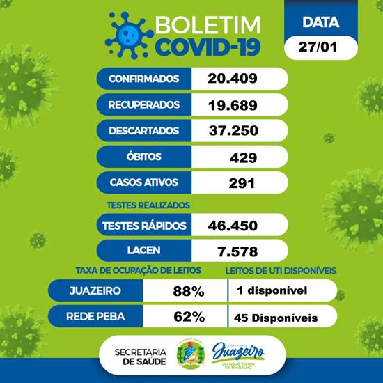 O percentual de ocupação dos leitos de UTI para Juazeiro na rede PEBA (hospitais de Pernambuco e Bahia) é de 62%, com 45 leitos disponíveis. Em Juazeiro, 88% dos leitos de UTI para pacientes com Covid-19 estão ocupados, com um disponível.