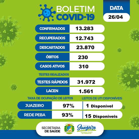 Na rede hospitalar, o percentual de ocupação dos leitos para Juazeiro na Rede PEBA (Pernambuco e Bahia) é de 93%, com 15 leitos disponíveis. Somente no território de Juazeiro, 97% dos leitos de UTI para pacientes com Covid-19 estão ocupados com um leito disponível.